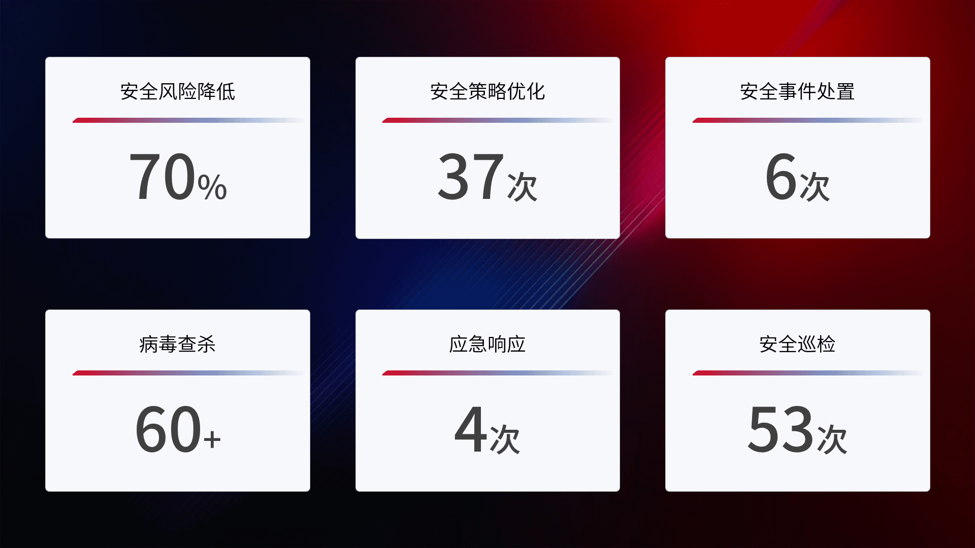 提供全面的安全事件报告体系,,包括处置报告、、、、周报、、季度和年度总结,,,,结合持续监控,,帮助客户深入了解网络安全状况。。