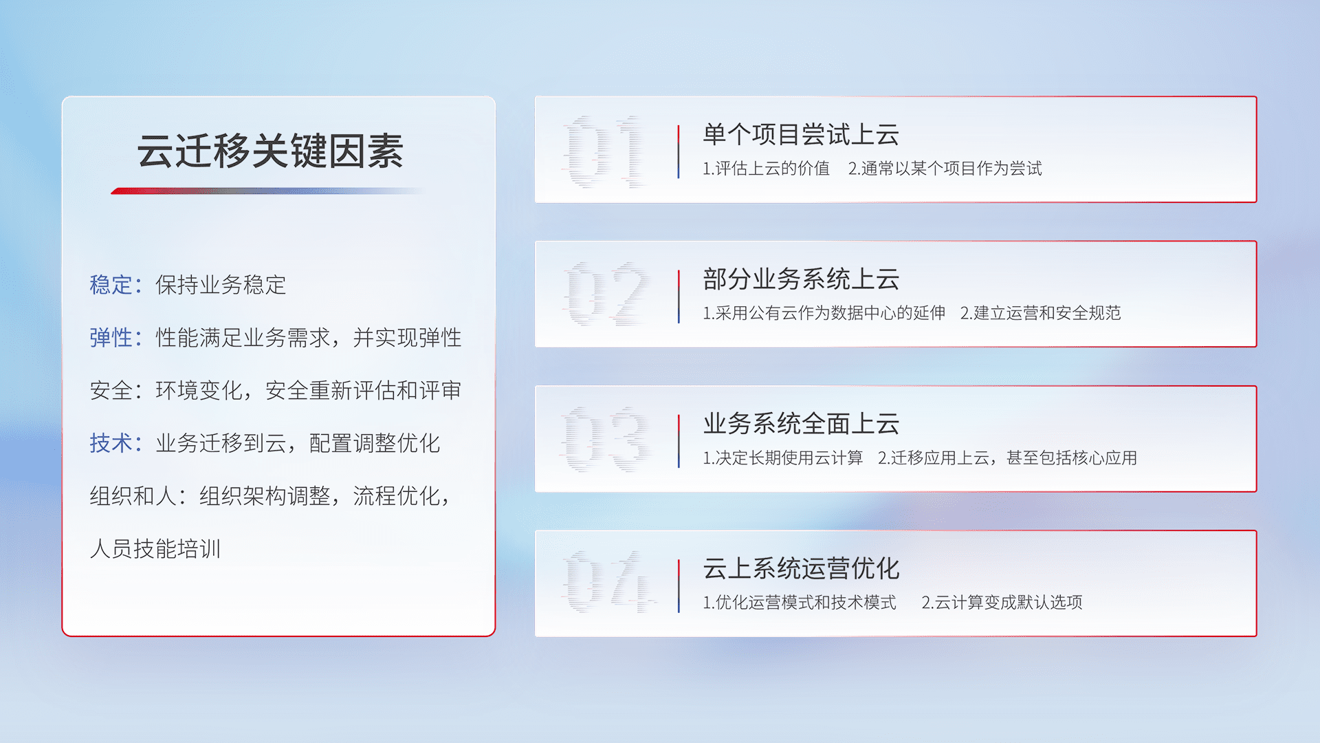 结合实际业务,,,,从规划设计、、云平台选型、、、云原生改造、、数据迁移、、集成交付,,迁移全过程为客户识别最佳上云路径,,,做好风险识别管理,,,设计网络架构、、、、身份权限、、、、安全审计合规、、、操作审计、、、、日志审计、、、、监控告警策略、、、多站点容灾设计等,,,,对云上基础设施进行整体规划,,,,提升IT治理水平,,,以满足弹性、、、高可用、、、、高性能的需求。。。