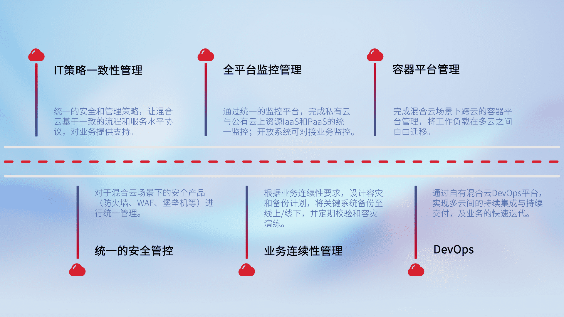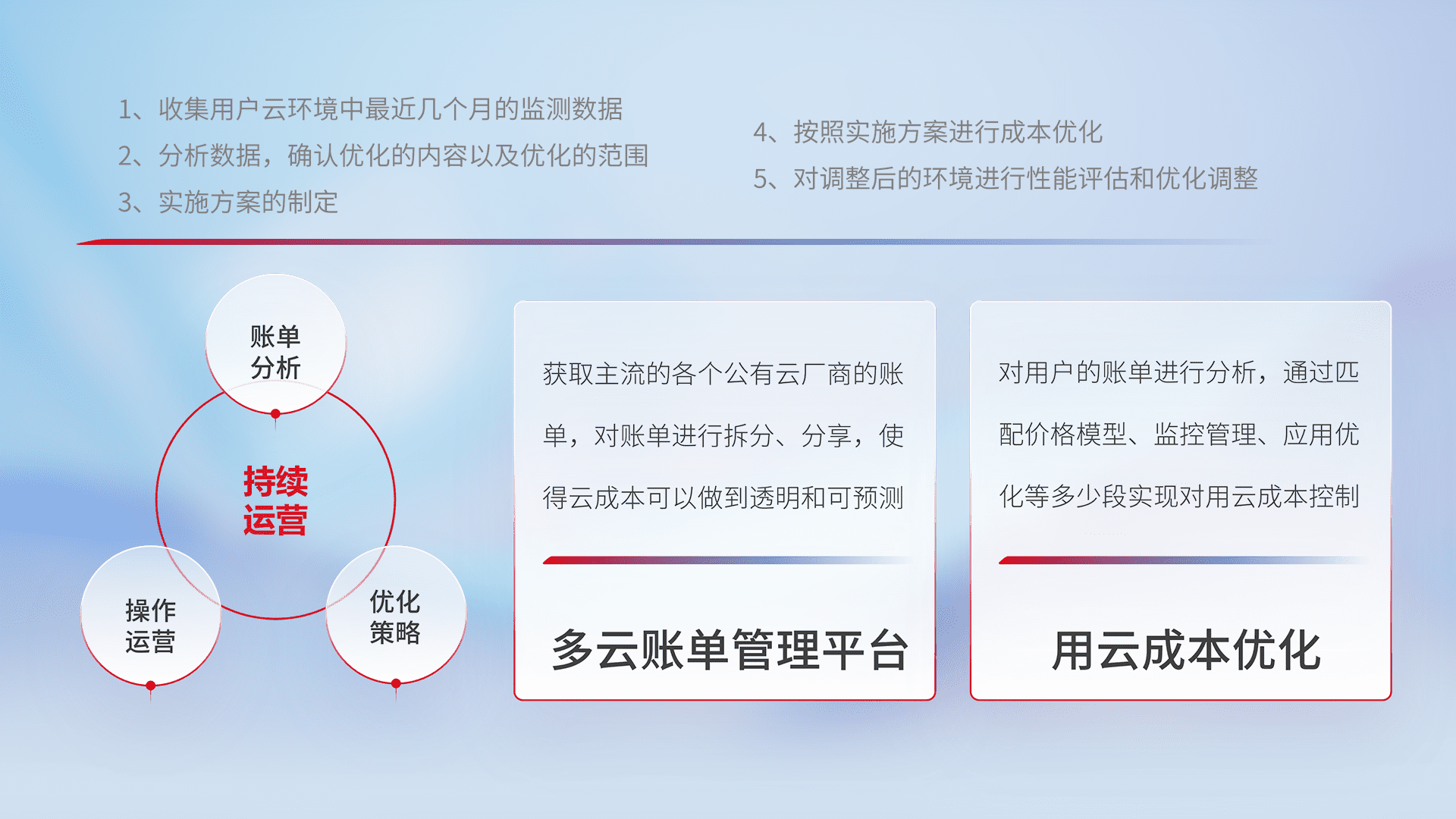 通过多云纳管,,,,以统一的资源数据模型把客户的云资源进行抽象和封装,,进而实现对多云资源的统一操作,,保障云资源管理的可靠性、、、、稳定性与可用性。。。。量身定制化运维内容,,,,配置、、、、开发运维、、补丁管理、、、、备份、、、监控、、、认证和访问管理、、审计和日常巡检等,,,保障在用云过程中的可靠度,,,稳定度以及高可用率。。。。